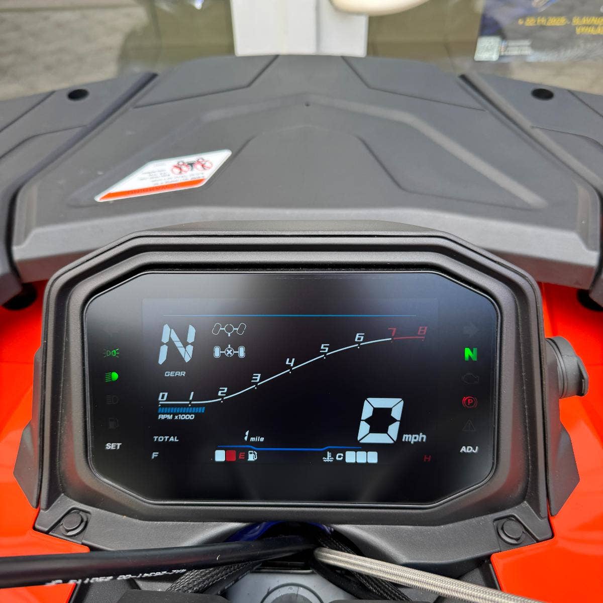 Plnobarevný 7" TFT displej s automatickým přepínáním denního a nočního režimu, funkce: rychloměr, otáčkoměr, palivoměr, hodiny, teploměr chladicí kapaliny, denní a celkové počítadlo kilometrů, ukazatele zařazené rychlosti, pohonu a výstražné kontrolky