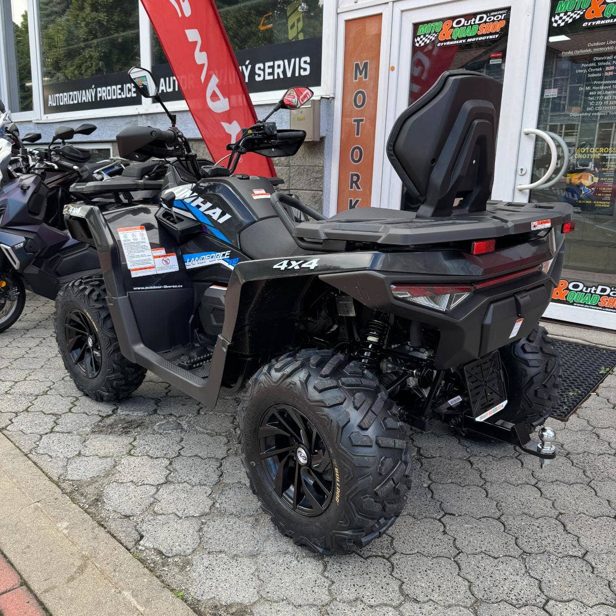 inhai Landforce 550L nabízí mimořádně bohatou výbavu, ve které nechybí atraktivní 12" litá kola se značkovými 25“ pneumatikami Bulldog, elektrický naviják 3000 lbs, homologované tažné zařízení, plnobarevný 7“ TFT displej. Vše, co si chcete vzít s sebou, pojmou kompozitní nosiče a praktické úložné schránky. Ve výbavě najdete i chrániče rukou, 12 V zásuvku, USB port nebo pohodlné vyvýšené sedadlo spolujezdce.