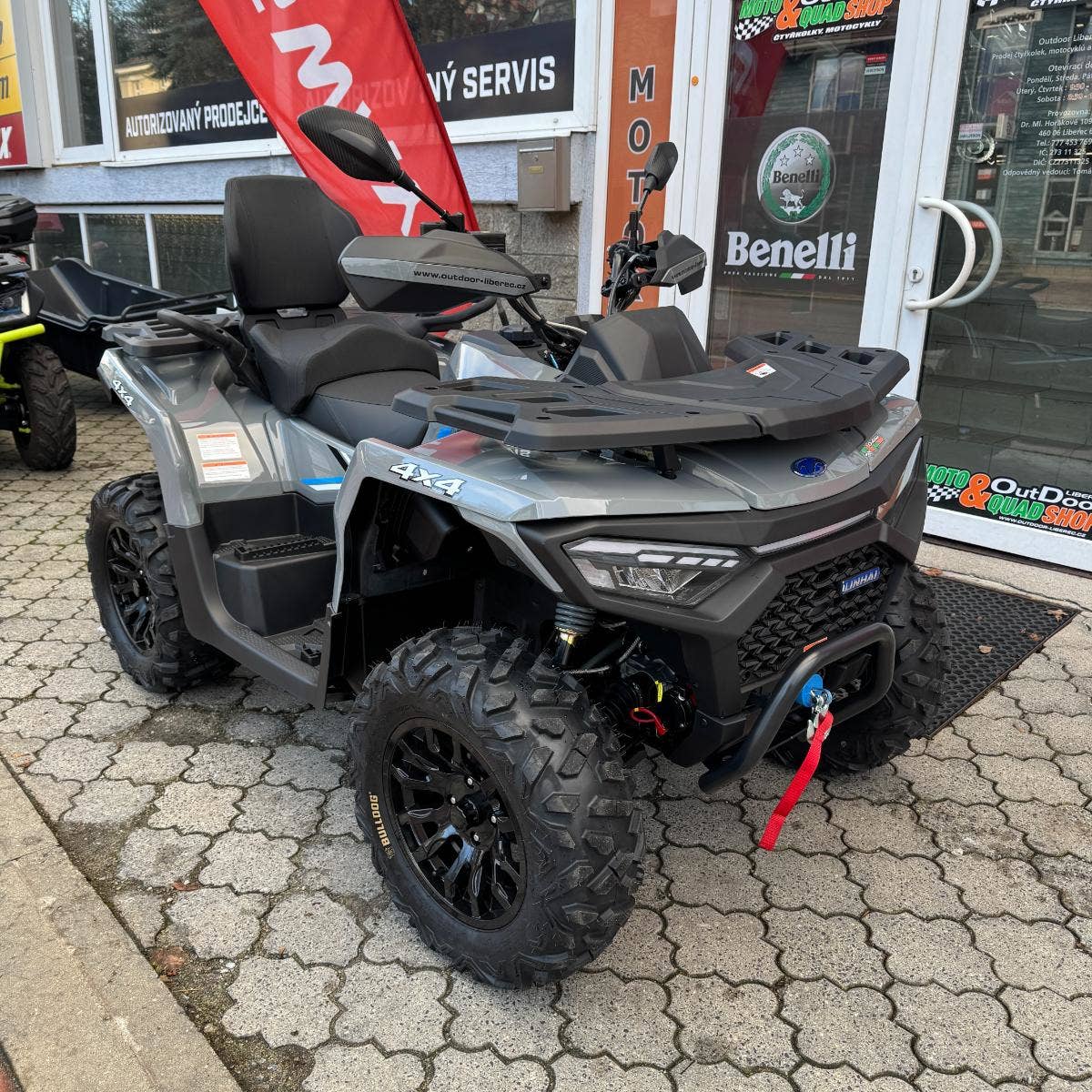 Elektrický naviják 3000lbs s nylonovým lanem, elektrický posilovač řízení EPS, homologované tažné zařízení, 14" designová ALU kola, značkové 26" pneumatiky Bulldog, kompozitové nosiče vpředu a vzadu, kryty páček a rukou, Full-LED osvětlení, velký 7“ TFT displej